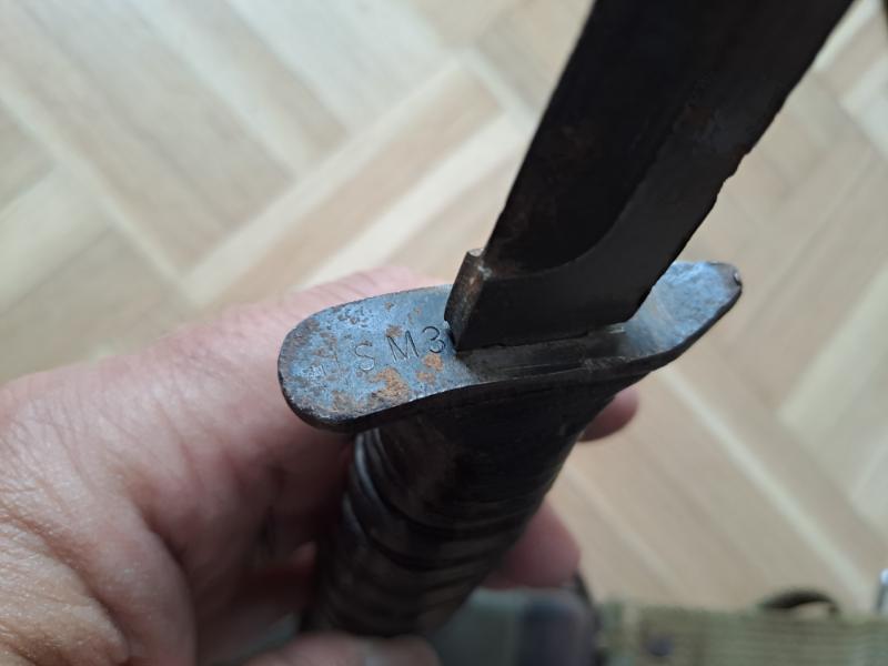 Bonjour je vous propose ce couteau USM3 dans fourreau USM8 jus de grenier. des traces de chocs sur le haut de la lame non tranchant. Pas de marquage fabriquant hormis USM3 sur la garde et la grenade d'ordonnance sur le haut du pommeau.