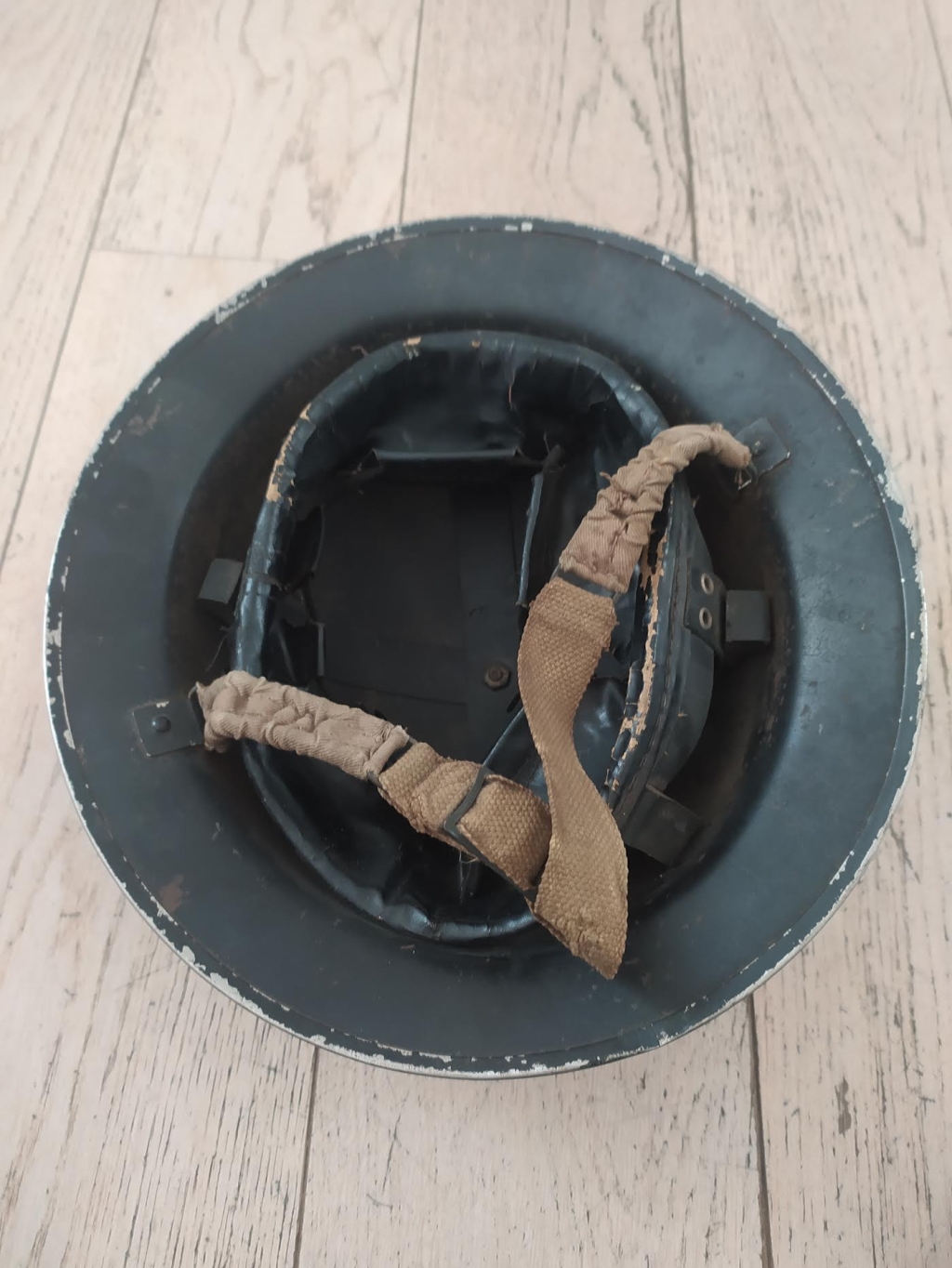 Coiffe d’ORIGINE !! en toile cirée sertie sur un cerclage en croix, tenue par une vis sommitale. Coiffe Mk1 sur coque Mk2 (comme l’a souvent exigé le War Office pour des raisons d’économie de matière).