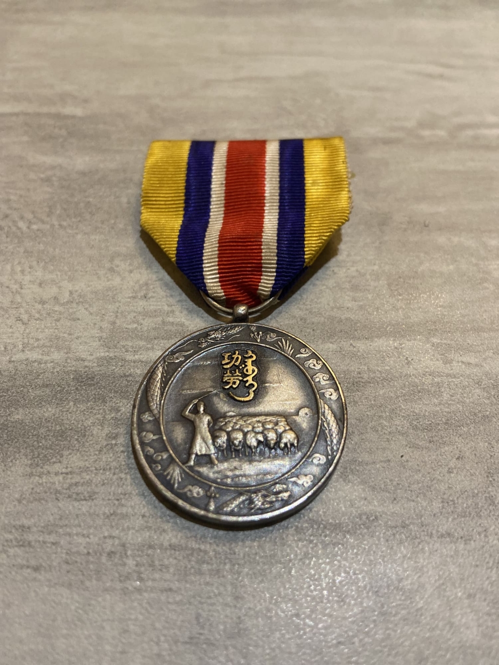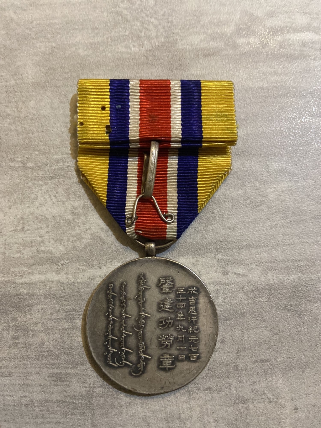 Rare médaille attribuée à partir de 1939 aux personnes ayant contribué à l’établissement du Gouvernement autonome unifié mongol (Mengjiang), entité ayant existé entre 1939 et 1945 sous un fort contrôle militaire japonais.