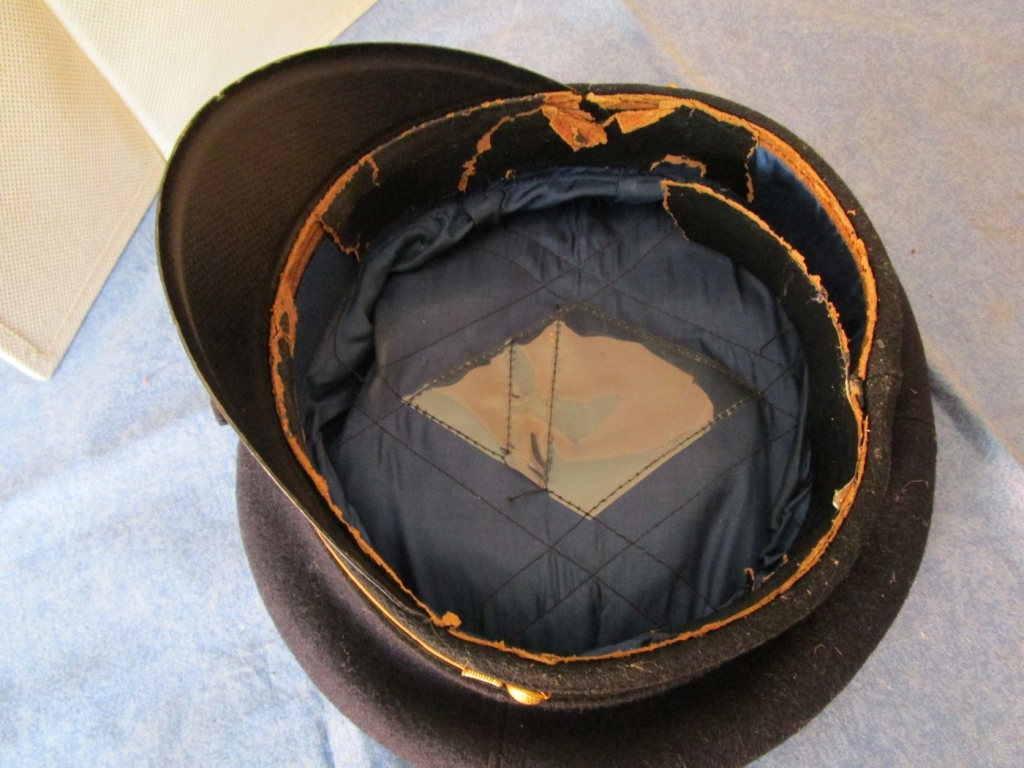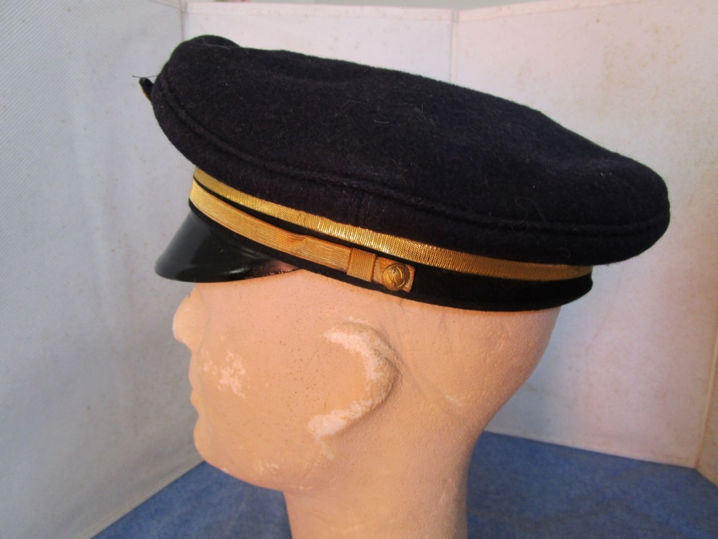 Casquette de lieutenant de l'armée de l'air des années 50/60. L'insigne est en partie décousu (à recoudre), La basane en carton noir est en partie abîmée, taille 57. Aucun trou de mite. Le passepoil est collé à l'arrière. Prévoir 11.20 en colissimo ou 7 euros par mondial relay. Autres photos sur demande.