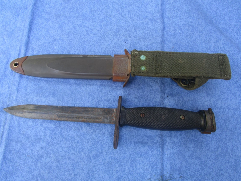 Bonne baïonnette US M7, fabrication américaine "BOC". Fourreau "US.M8A1 PWH". Petite oxydation sur les parties métalliques (voir photos). Verrou et bouton pression bien fonctionnels. Lame non affutée. Autres photos sur demande. Prévoir 11.20 euros en colissimo ou 7 euros par mondial relay.